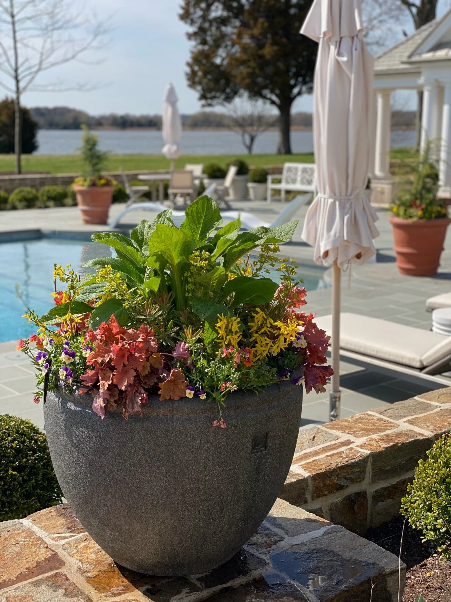 This expansive Eastern Shore Manor, nestled along the Miles River, spans over 100 acres of pristine waterfront. The property features a range of structures, including a versatile all-seasons "barn," a pool house, a pottery studio, and a glass greenhouse. Designed by Campion Hruby Landscape Architecture, this award-winning project boasts numerous outdoor entertainment areas, allowing us to craft containers that enhance and complement each unique space. Our designs include a diverse array of containers in various styles, materials, and sizes—from large cold-rolled steel pieces to imported terra cotta and vintage finds. With over 100 containers and window boxes to outfit, we are continuously engaged in creating timeless, elegant designs that harmonize with and anchor the expansive landscape throughout the year.