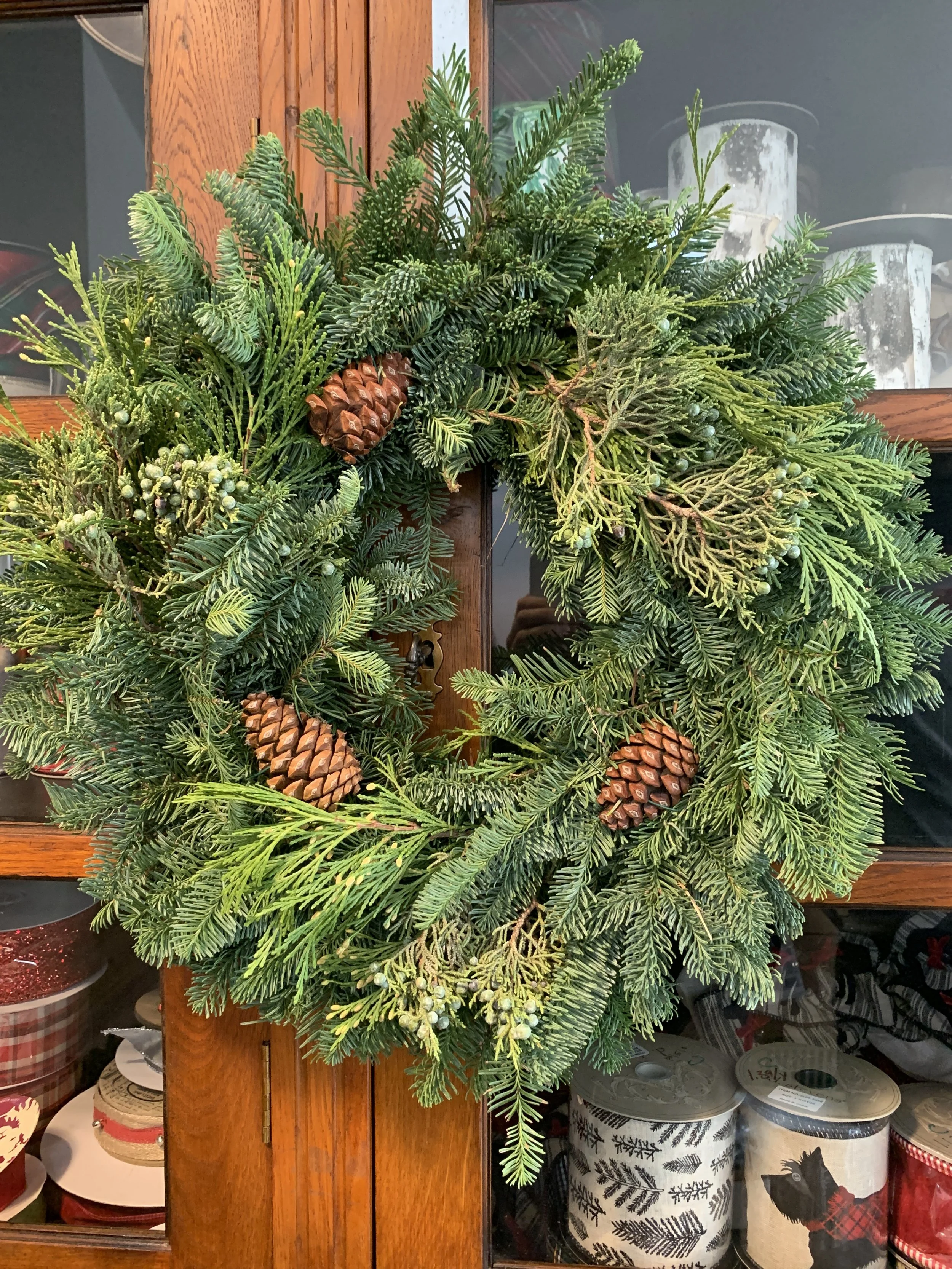 This 38” Greens Medley wreath is the perfect backdrop to show off our beautiful oyster shells nestled in between its variety of fir, noble, and cedar branches with pine cones. Each wreath may vary, the picture is for representation purposes only.